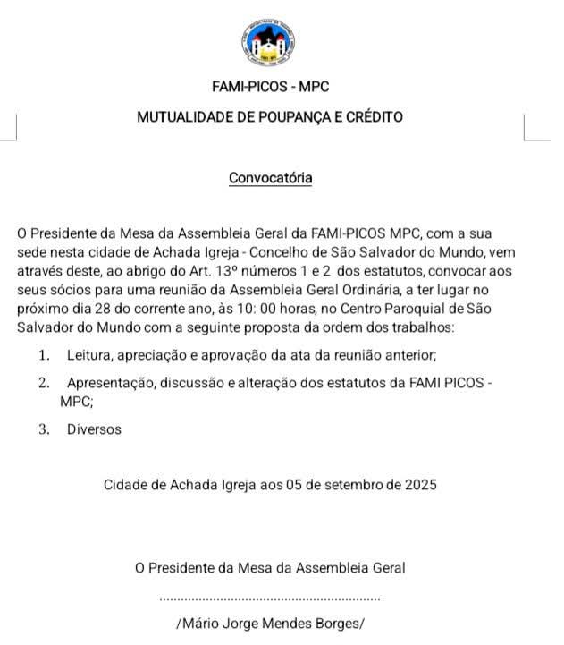 O Presidente da Mesa da Assembleia Geral da FAMI-PICOS MPC, com a sua sede nesta cidade de Achada Igreja - Concelho de São Salvador do Mundo, vem através deste, ao abrigo do Art. 13º números 1 e 2 dos estatutos, convocar aos seus sócios para uma reunião da Assembleia Geral Ordinária, a ter lugar no próximo dia 28 do corrente ano, às 10:00 horas, no Centro Paroquial de São Salvador do Mundo com a seguinte proposta da ordem dos trabalhos: